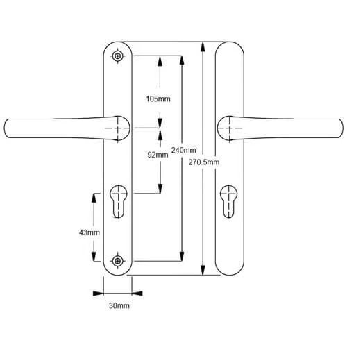 This Easyfit handle set has unsprung 92pz internal and external levers on a 270mm x 30mm backplate which is available in white and gold finishes. The distance between the fixing screws is 240mm with the bottom screw positioned 18mm below the euro profile cut-out. Supplied as a pair complete with fixings consisting of a spindle and 2 pairs of colour co-ordinated screws of differing lengths to suit different door profiles.