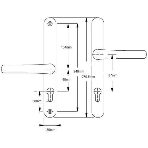 This Easyfit handle set, suitable for the ABT Gibbons multipoint lock, has unsprung 48pz internal and 87pz external offset levers on a 270mm x 30mm backplate. Available in white and gold finishes.The distance between the fixing screws is 240mm with the bottom screw positioned 33mm below the euro profile cut-out.