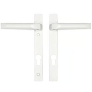 These Hoppe handles from the London range have sprung 92pz internal & external levers. With a backplate size of 270mm x 30mm they are available in various finishes. The distance between the fixing screws is 240mm with the bottom screw positioned 17mm below the euro profile cut-out. They are supplied as a pair complete with spring cassettes, an 8mm square spindle & 2 colour co-ordinated bolt through M5 screws to suit door thickness 64-73mm.