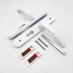 These Hoppe handles from the London range, which have unsprung 72pz internal & external levers, were commonly used on the Fuhr 3 part multipoint range. With a backplate size of 205mm x 28mm they are available in various finishes.They are not compatible with spring cassettes. The distance between the fixing screws is 180mm with the bottom screw positioned 18mm below the euro profile cut-out. They are supplied as a pair complete with an 8mm square spindle & 2 colour co-ordinated bolt through M4 screws to suit door thickness 68-77mm.